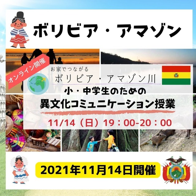 【ウユニ塩湖がある国★ボリビアと生中継!】 オンラインで海外の街と生中継で繋がり、 異文化を感じながら、 自分に何ができるのかな?と 考えてもらえる機会を提供しています。 11月14日はボリビア! 誰もが行きたいと思う憧れの地 ウユニ塩湖は有名ですね。 そんなボリビアは どんな文化があるんだろう? どんな暮らしをしているんだろう? 現地とリアルタイムで繋ぎ 紹介していただきます。 アマゾン川のほとりに住むボリビアの子ども達にも登場してもらいますよ!! 交流しながら楽しみましょう。 ==== 【生中継授業内容】 ・ボリビア&動物クイズ ・ボリビアでのお仕事って? ・どんな食文化があるの? ・通貨、物価、何が買えるだろう? ・子ども達の生活、学校は?遊びは? ※コミュニケーション授業ですので、是非ボリビアのガイドさんにも直接質問ください! ※当日の状況により、内容は変更になる場合がございます ============= 【イベント詳細】 11月14月(日)19:00~20:00 参加方法:Zoomにて 対象:小中学生向けの内容となりますが、 ご了承頂いた上で他の年齢の方もご参加可能です。 クイズが出ますので、紙とペンをご用意ください! =========== ____________________ <添乗員:Junkoさん> 大手旅行会社勤務後、添乗員10年。訪問国は80か国。 教育旅行にも多数携わり、Junkoと行くツアーが発売されるなど人気添乗員。 関西弁で子ども達の心をつかむ軽快なトークと、子ども目線での街や暮らしの紹介が好評。 _______